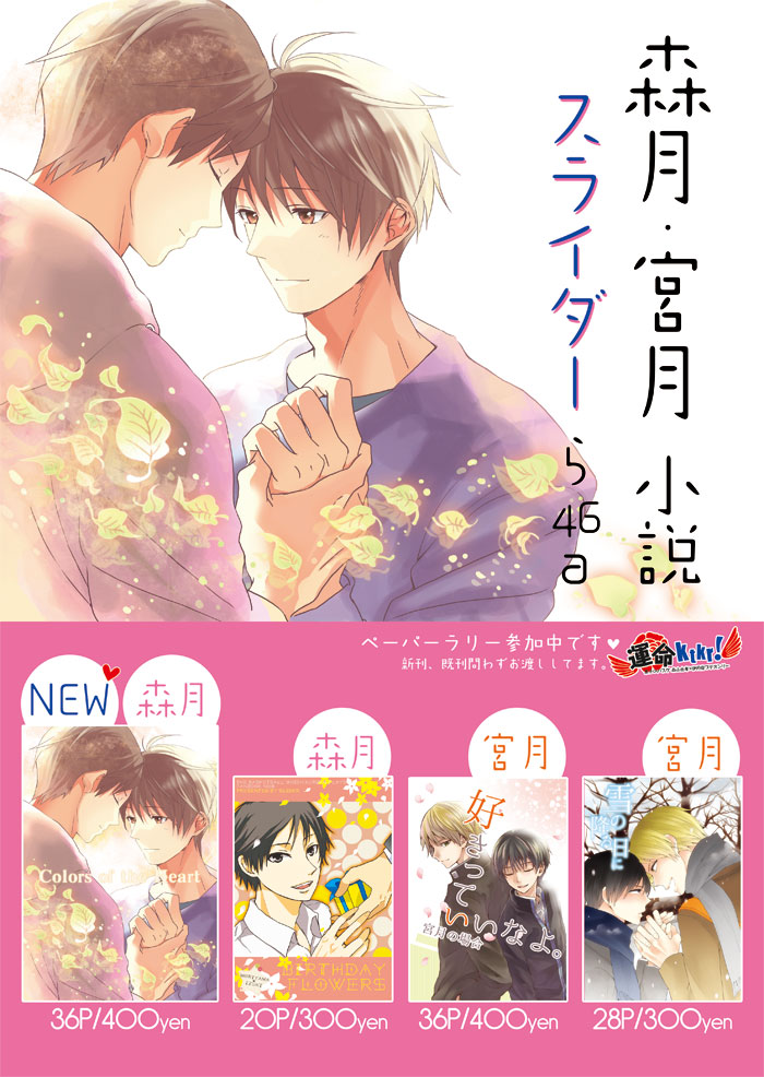 森月プチオンリー「運命ktkr!」記念アンソロジー『MORITSUKIラヴ』の方にも参加させて頂きましたので、合わせてよろしくお願いいたします。